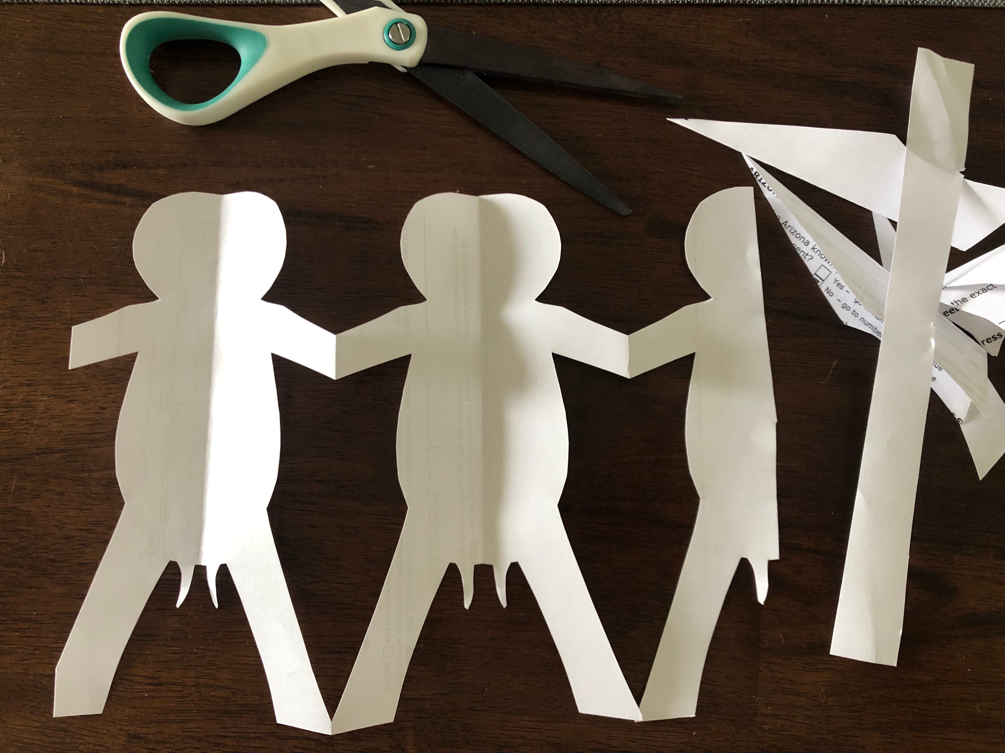 If you have a long piece of paper you can fold it up and cut it to make a snowflake-style chain of cutout people holding hands. It’s kinda like having your whole family follow your sly, secondary Facebook page.